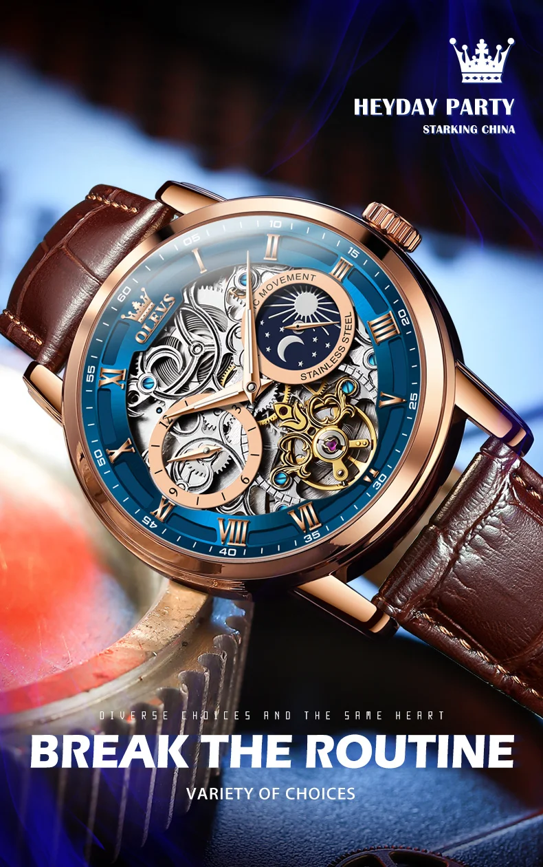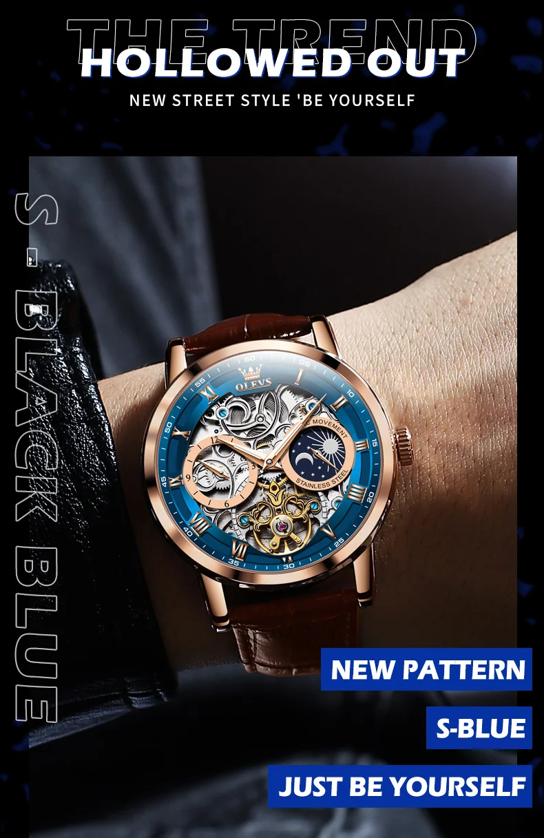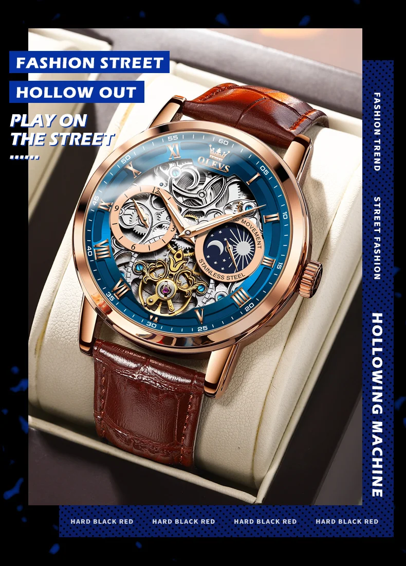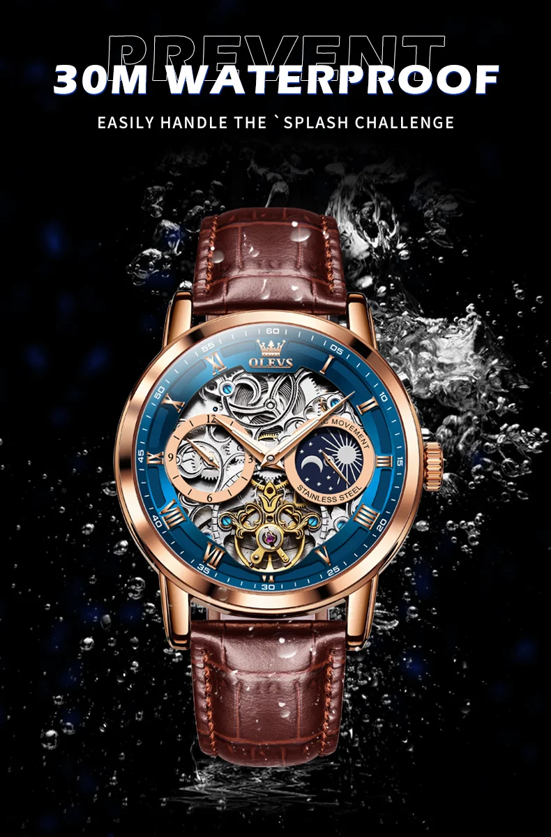 OLEVS Top Marke Männer Skeleton Mechanische Uhr - Wasserdicht, Lederband, Mondphase, Tourbillon Armbanduhr