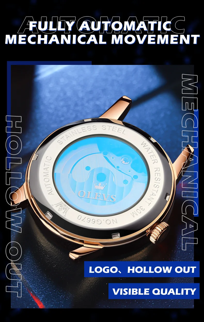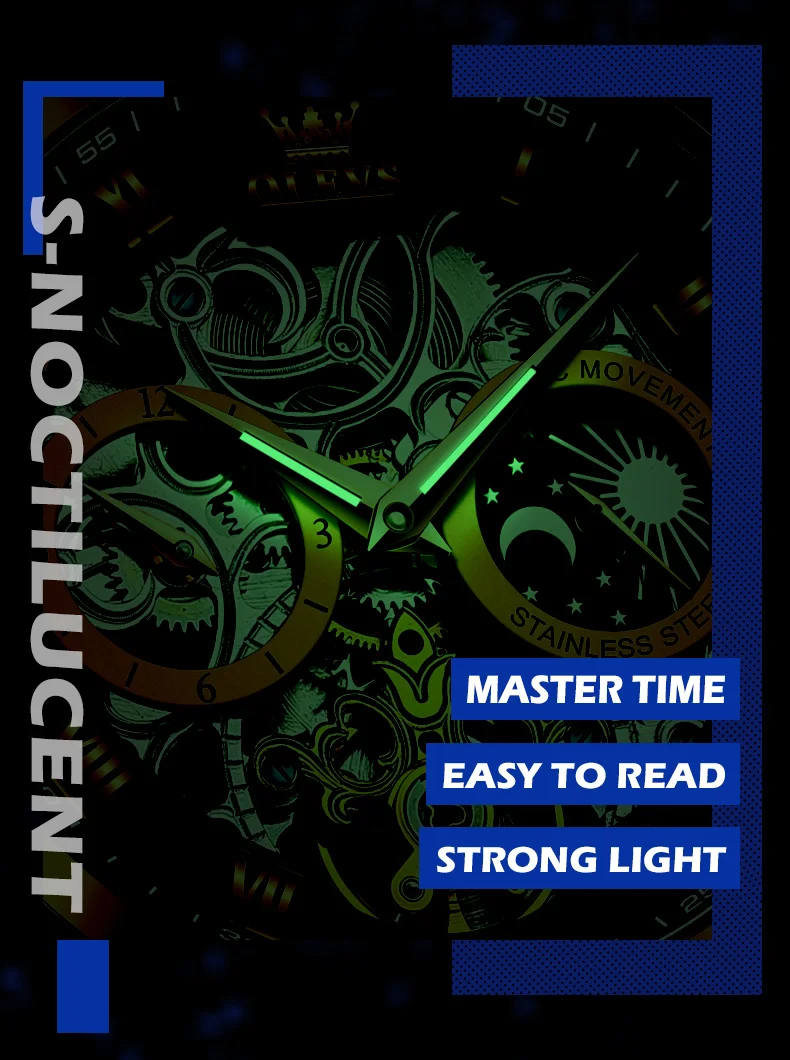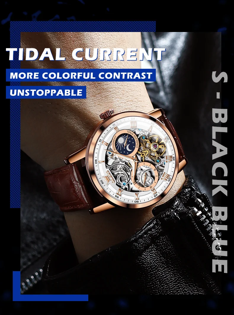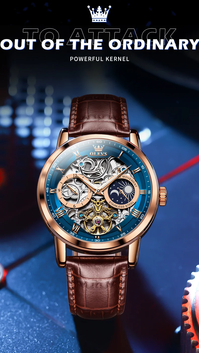 OLEVS Top Marke Männer Skeleton Mechanische Uhr - Wasserdicht, Lederband, Mondphase, Tourbillon Armbanduhr